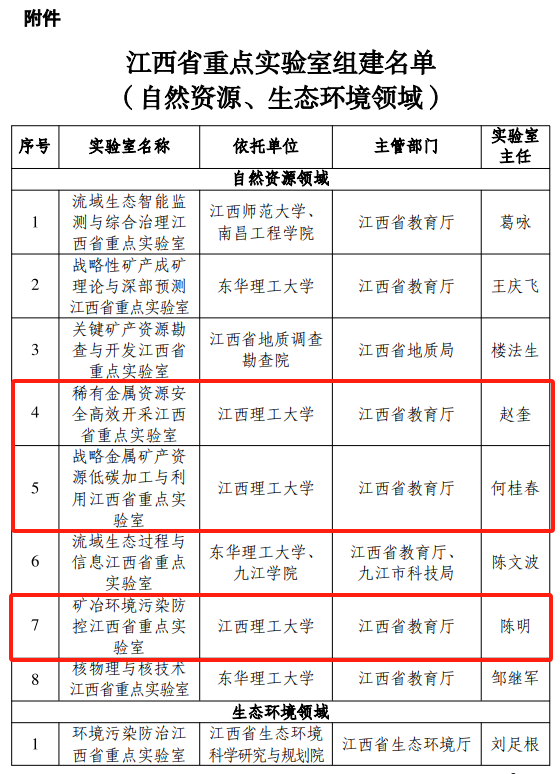 本网讯 近日,江西省科技厅下发了《关于组建自然资源、生态环境领域省重点实验室的通知》(赣科发财字〔2023〕129号),百家乐 申报的战略金属矿产资源低碳加工与利用江西省重点实验室、矿冶环境污染防控江西省重点实验室、河流源头水生态保护江西省重点实验室、稀有金属资源安全高效开采江西省重点实验室获批组建。
