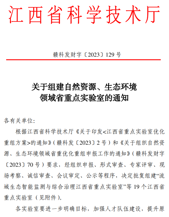 据悉,为构建特色鲜明、能力卓越的江西省重点实验室体系,支撑江西省经济社会高质量发展,省科技厅分批次对江西省重点实验室开展优化重组,首批自然资源、生态环境领域经组织申报、形式审查、专家评审、现场考察、诚信审查、会议审定、公示等程序,决定批复组建江西省重点实验室19个。