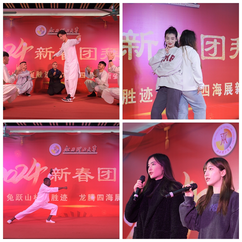 团拜会上,留校同学们献上了自编自演的精彩文艺节目。土木与测绘工程学院苏比努尔、布威艾杰尔以一场《舞蹈串烧》拉开序幕,土木与测绘工程学院西仁阿依和经济管理学院麦迪努尔带来的《红色高跟鞋》、国际教育学院穆长青带来的《遥远的你》把现场喜庆的气氛推向了高潮,国际教育学院阿卜杜等同学的《阿富汗舞蹈》“舞”出新年的气氛,国际教育学院的法曼用《中国功夫》展现了中华武术的魅力。精彩的表演赢得了现场热烈的掌声,展示了江理学子的青春才华。