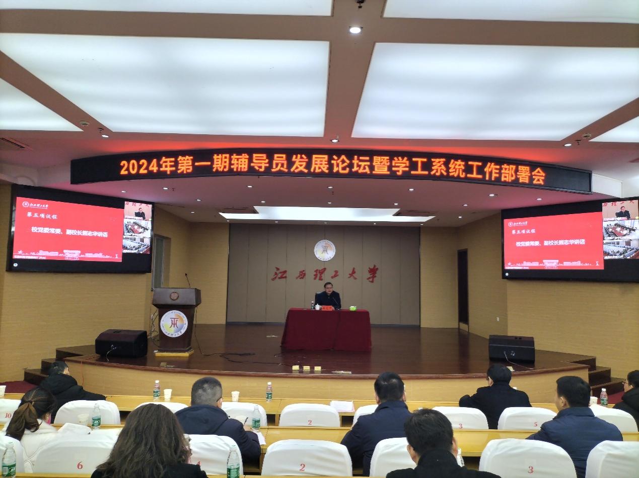 2024年春季学期学工系统工作部署会暨辅导员发展论坛在红旗校区赵氟隆图书馆学术报告厅召开,校党委常委、副校长熊志华出席本次会议并讲话。党委武装部、党委研究生工作部、党委学生工作部、校团委、国际教育学院相关人员,全体专兼职辅导员参加会议。会议由党委学生工作部、学生工作处处长贾群燕主持,南昌校区、先进铜产业学院视频参会。