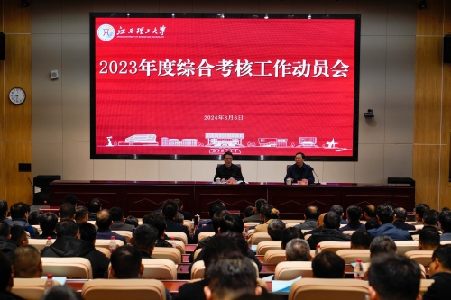 在三江校区启航会议中心1号会议厅召开2023年度综合考核工作动员会。省委第十一考核组组长、省委教育工委副书记郑志军一行来校开展2023年度综合考核工作,并对校领导班子和领导干部开展年度考核,对党委书记落实党建工作责任制、党委领导班子落实意识形态工作责任制、干部选拔任用工作等进行民主评议。