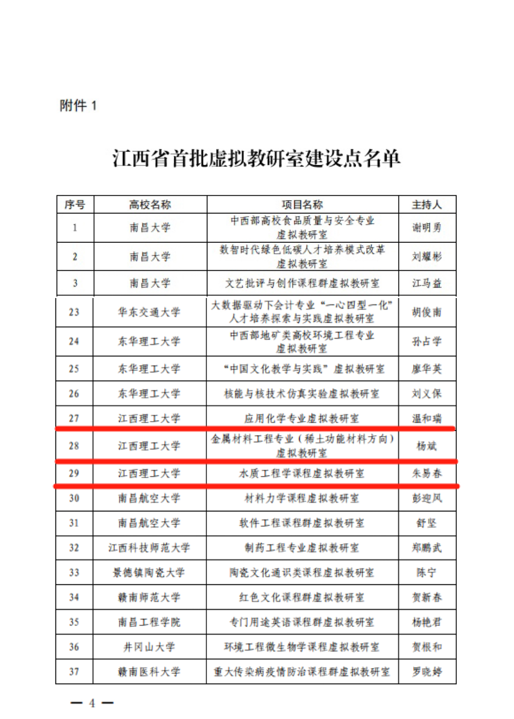 本网讯 近日,江西省教育厅下发了《关于公布2023年江西省首批虚拟教研室立项建设名单的通知》(赣教高字〔2023〕51 号),百家乐 申报的应用化学专业虚拟教研室、金属材料工程专业(稀土功能材料方向)虚拟教研室、水质工程学课程虚拟教研室获批确立为首批江西省虚拟教研室立项建设点。