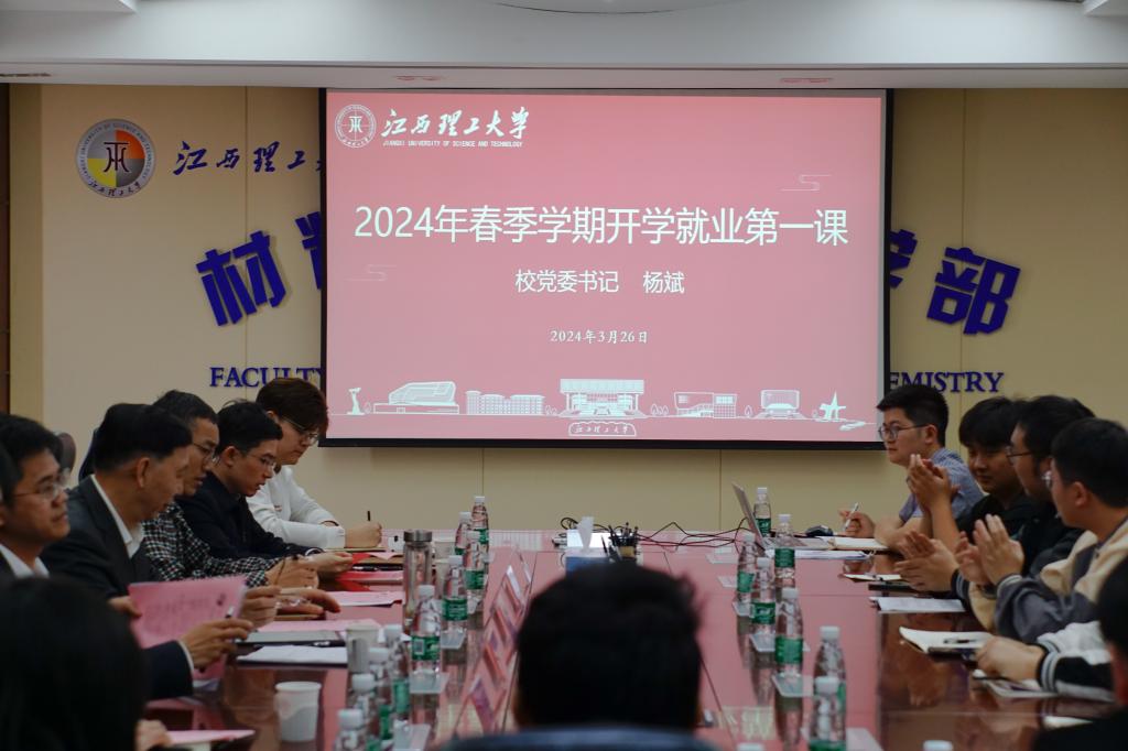 本网讯  3月26日上午,校党委书记杨斌来到稀土学院为师生上“开学就业第一课”。稀土学院班子成员、就业辅导员及学生代表共同聆听。讲座由稀土学院院长汪航主持。