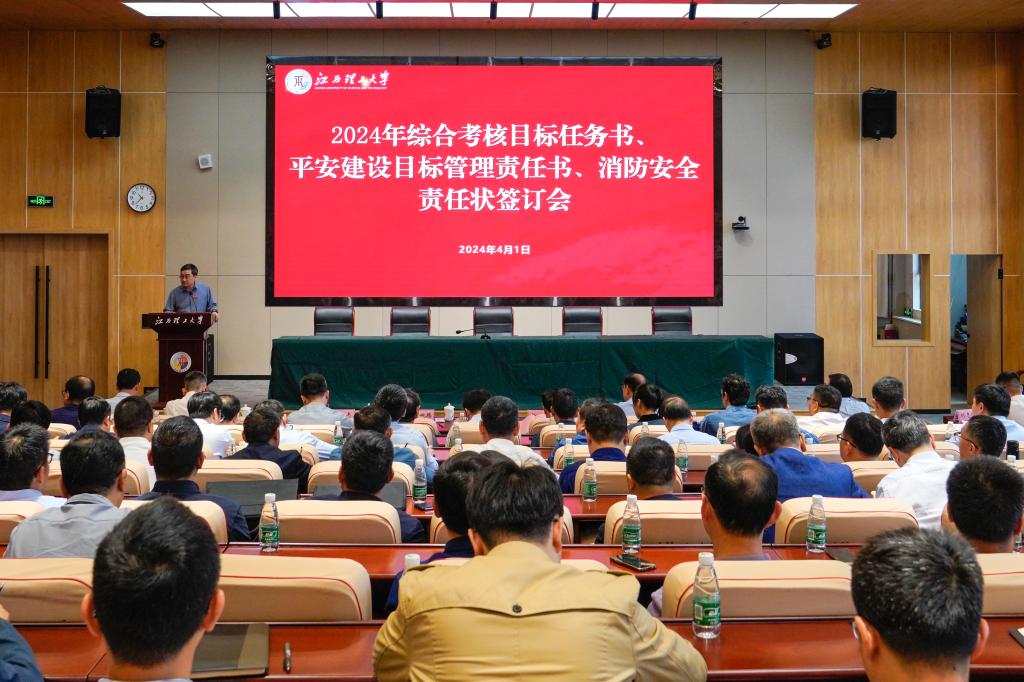 2024年度综合考核目标任务书、平安建设目标管理任务书、消防安全责任状签订会在三江校区启航会议中心1号会议厅举行。全体在家校领导、党委常委出席,全体中层正职和主持(或牵头)工作的中层副职参加会议。签订会由校党委常委、副校长黄志繁主持。