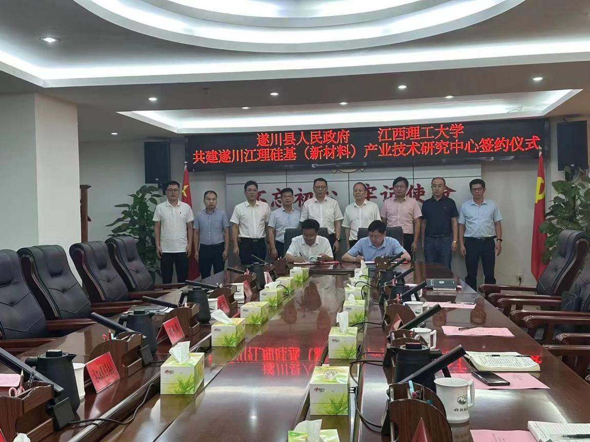 签约仪式上,校科学技术处长吴彩斌,遂川县工业园区管委会主任薛朝华分别代表校企双方签署了共建遂川江理硅基(新材料)产业技术研究中心合作协议。