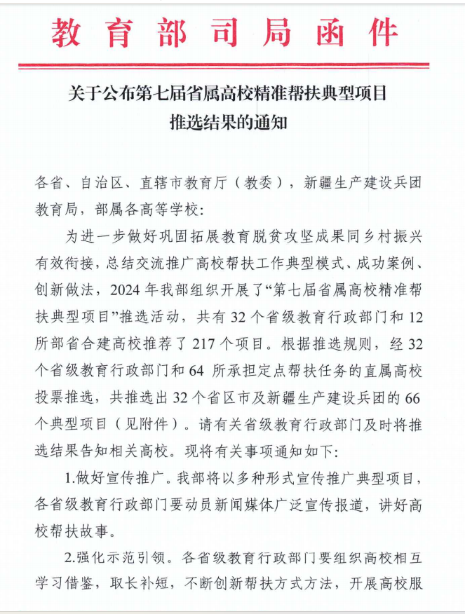 据悉,为总结交流推广高校帮扶工作的成功案例、典型做法、创新经验,今年7月教育部发展规划司开展了第七届省属高等学校精准帮扶典型项目推选活动,经32个省级教育行政部门和64所承担定点帮扶任务的直属高校投票推选出66个典型项目。