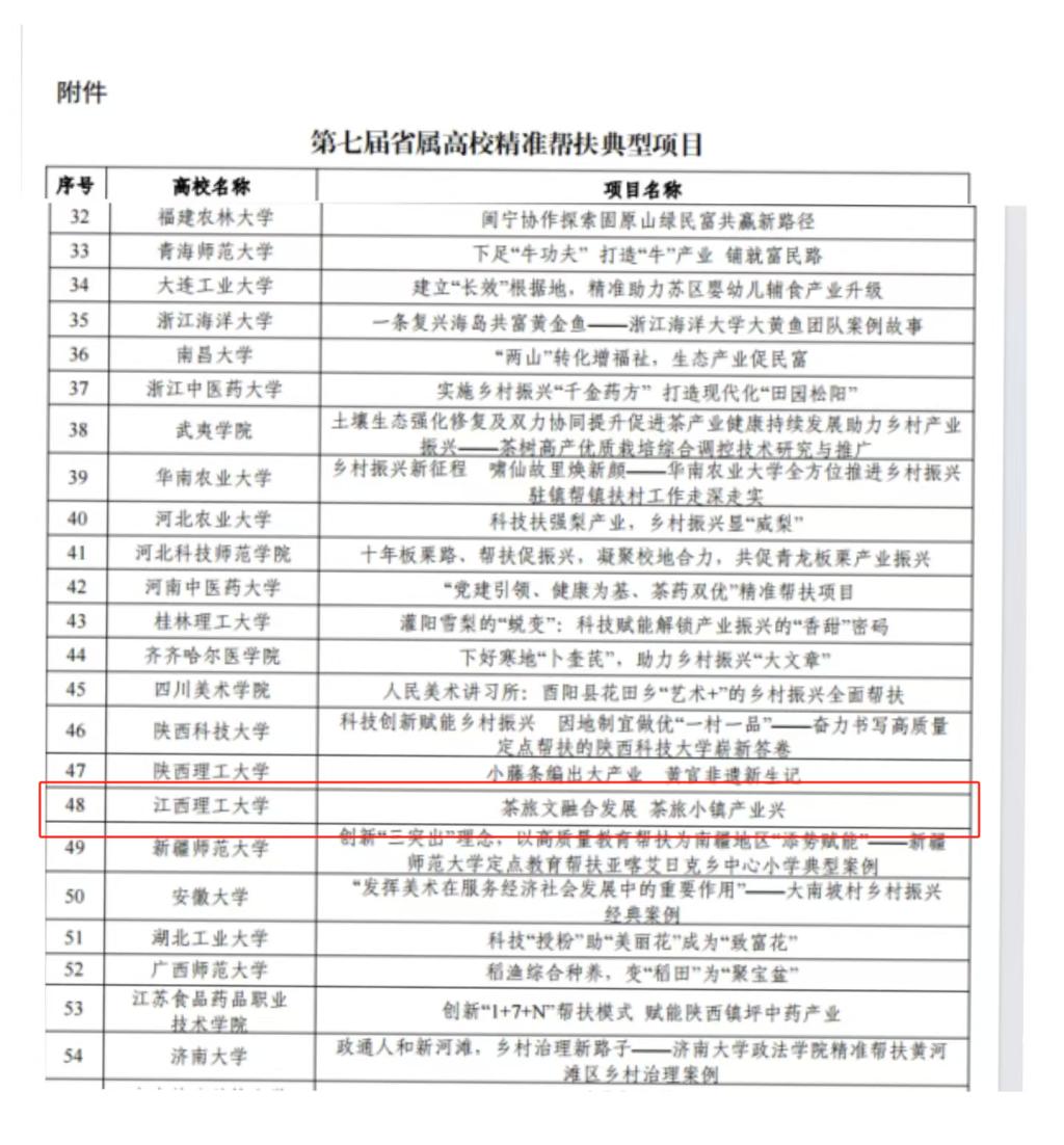 《茶旅文融合发展 茶旅小镇产业兴》项目成功入选精准帮扶典型项目,全省仅2所高校获此殊荣。