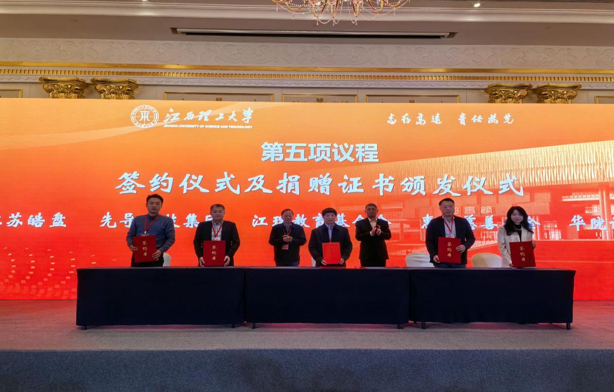 在捐赠签约仪式上,惠明慈善基金会授权代表冯锦华董事长,先导科技集团代表陈应红副总经理,江苏皓盘科技公司代表王浩副总经理,华院计算技术(上海)代表王燕霞董事会秘书,与邱廷省签订了捐赠协议。龚姚腾为捐赠单位颁发了捐赠证书并合影留念。
