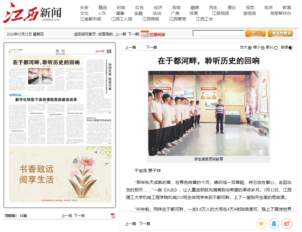 强化思想引领聚焦信念铸魂,激发红齿轮向心力。严格落实思政第一课制度,学院党委书记积极开展主题党课,为广大师生筑牢信仰之基;开展形式多样的主题党团日活动,组织学生赴于都、瑞金等地研学,在实地体验中传承红色基因;邀请全国劳模等模范人物走进校园,让学生在持续的熏陶与激励下,逐步成长为满怀家国情怀与担当的新时代青年。学院“行走的思政课”被新华网、江西日报等媒体报道。