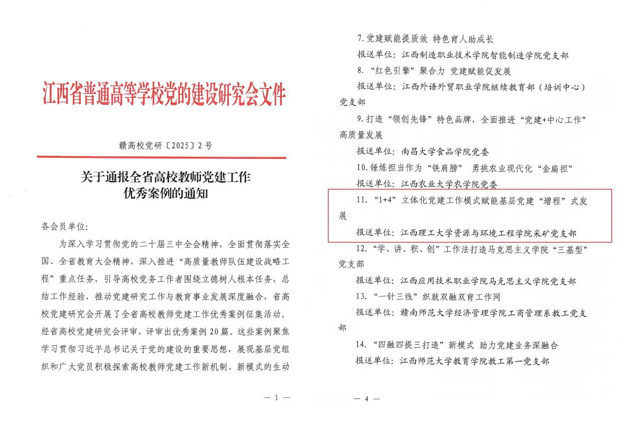资源与环境工程学院采矿党支部的《“1+4”立体化党建工作模式赋能基层党建“增程”式发展》成功获评,全省仅20篇。