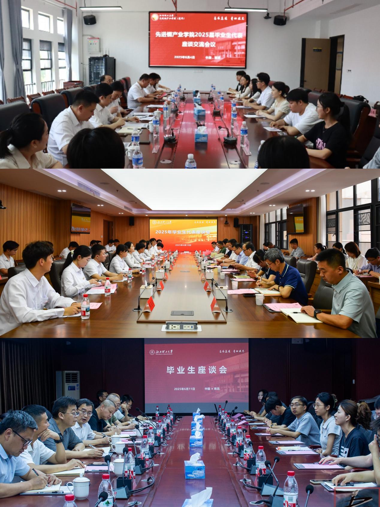在三江校区、南昌校区和先进铜产业学院分别召开2025届毕业生代表座谈会。校党委书记杨斌,校长、中国工程院院士葛世荣,校党委副书记徐志峰,校党委常委、副校长黄志繁、熊志华分别出席会议。相关职能部门负责人、优秀毕业生代表参加会议。
