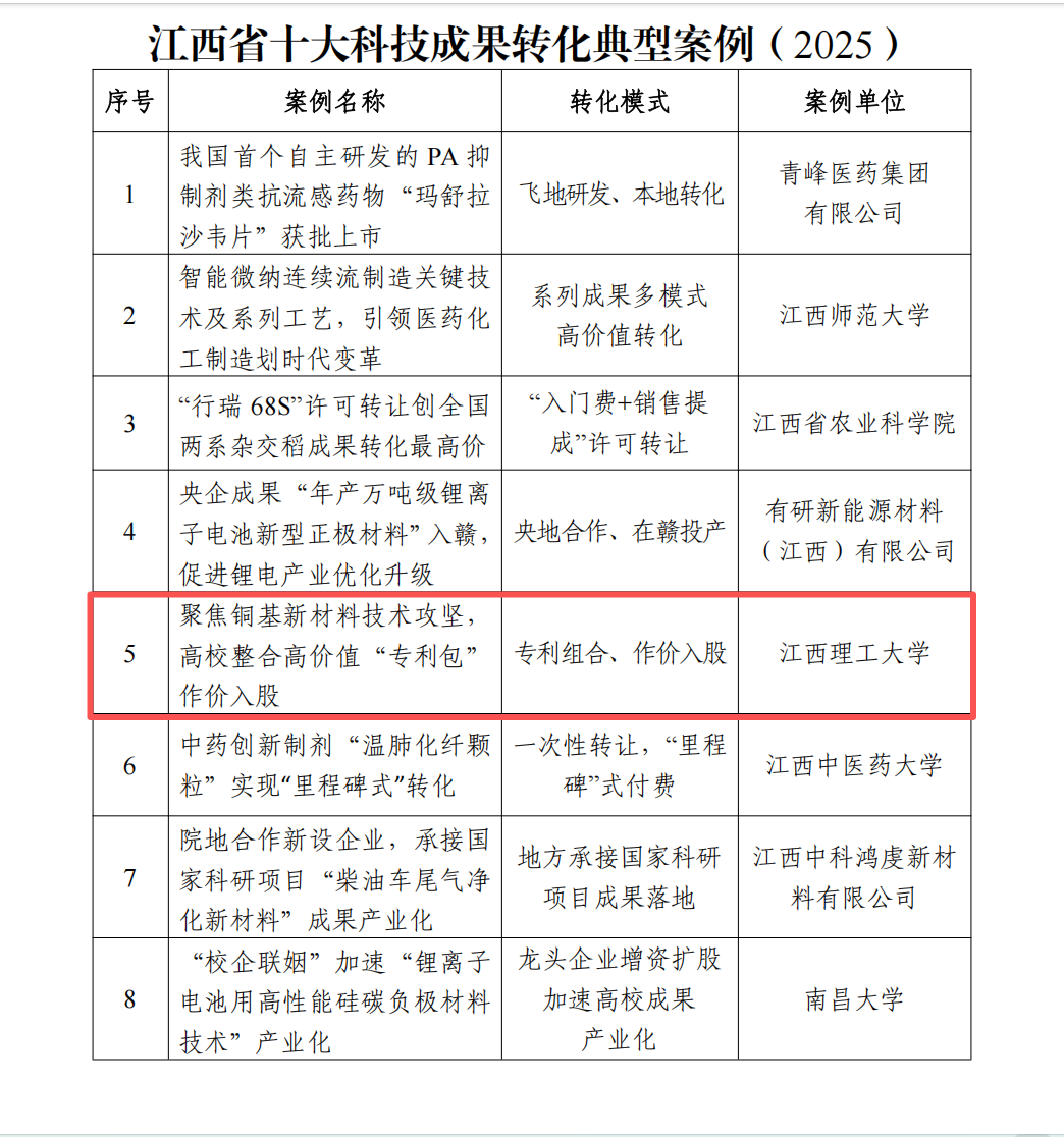 以专利组合为“金钥匙”、以作价入股为“新路径”,在科技成果转化方面取得重要突破。成果转化项目“聚焦铜基新材料技术攻坚,高校整合高价值‘专利包’作价入股”凭借对产业升级的显著推动作用及对成果转化模式的创新突破,成功入选2025江西省十大科技成果转化典型案例,为高校服务地方产业发展树立了示范标杆。