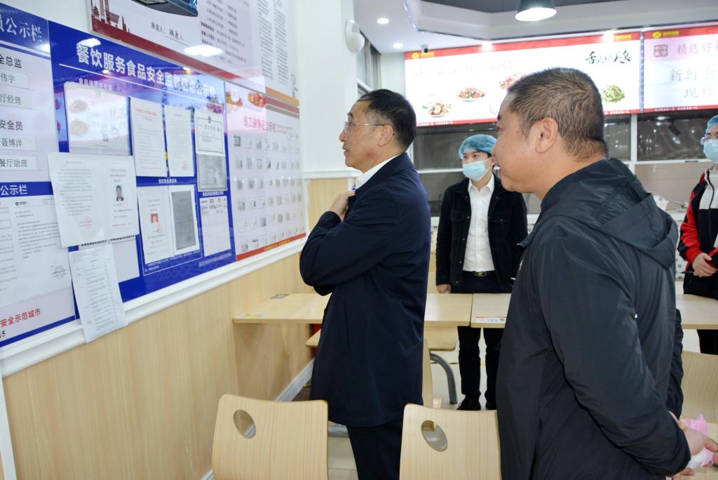 随后,刘祖文一行前往校园食堂,重点检查食品安全卫生管理工作。他深入食堂后厨操作间、食材储存仓库、餐具消毒间等关键区域,仔细查看食材采购验收记录、食品加工制作流程、环境卫生状况及餐具消毒情况,详细了解食堂工作人员健康管理、食品留样制度执行等细节。在与食堂负责人交流时,刘祖文要求食堂管理人员要始终把食品安全放在首位,严格落实食品安全主体责任,健全完善食品安全管理制度,加强对食材采购、加工、售卖全流程的监督管控。他强调,校园食品安全是校园安全的重要组成部分,直接关系到师生的身体健康与生命安全,容不得丝毫马虎。他要求校区管理人员加强监管,定期开展食品安全隐患排查,切实筑牢校园食品安全防线,守护好师生“舌尖上的安全”,让师生吃得放心、吃得安心。