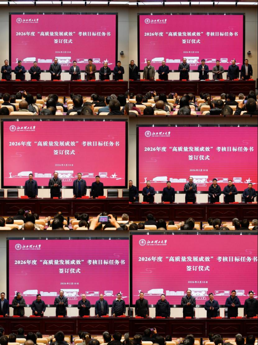 二级机构调整宣布大会暨2026年度“高质量发展成效”考核目标任务书签订仪式在三江校区启航会议中心举行。校党委书记刘祖文,中国工程院院士、校长葛世荣出席会议并讲话。全体在家校领导、党委常委,全校中层干部参加会议,见证签订仪式。