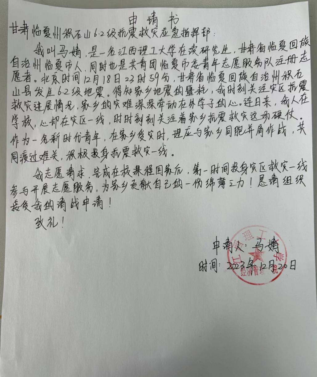 经济管理学院2023级研究生马婧毅然请战,申请返乡与家乡共克时艰。