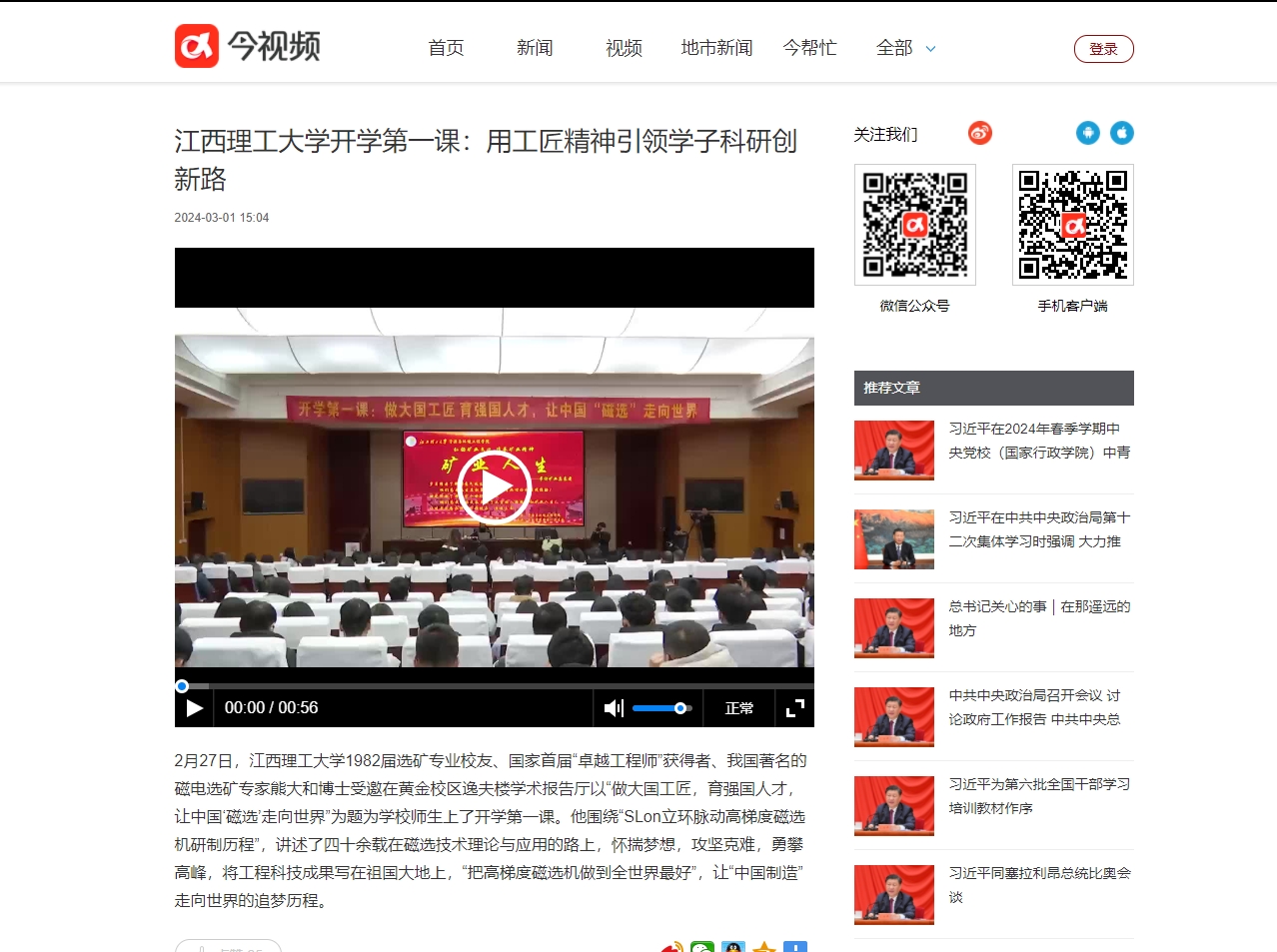 2月27日,百家乐 1982届选矿专业校友、国家首届“卓越工程师”获得者、我国著名的磁电选矿专家熊大和博士受邀在黄金校区逸夫楼学术报告厅以“做大国工匠,育强国人才,让中国‘磁选’走向世界”为题为学校师生上了开学第一课。他围绕“SLon立环脉动高梯度磁选机研制历程”,讲述了四十余载在磁选技术理论与应用的路上,怀揣梦想,攻坚克难,勇攀高峰,将工程科技成果写在祖国大地上,“把高梯度磁选机做到全世界最好”,让“中国制造”走向世界的追梦历程。