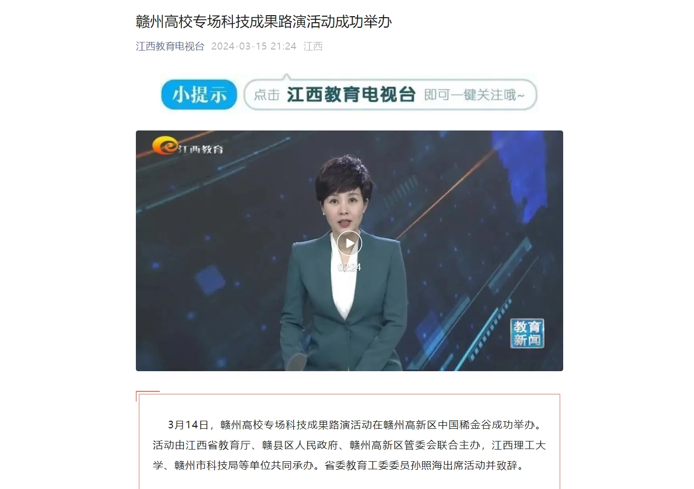 3月14日,赣州高校专场科技成果路演活动在赣州高新区中国稀金谷成功举办。活动由江西省教育厅、赣县区人民政府、赣州高新区管委会联合主办,百家乐 、赣州市科技局等单位共同承办。省委教育工委委员孙照海出席活动并致辞。