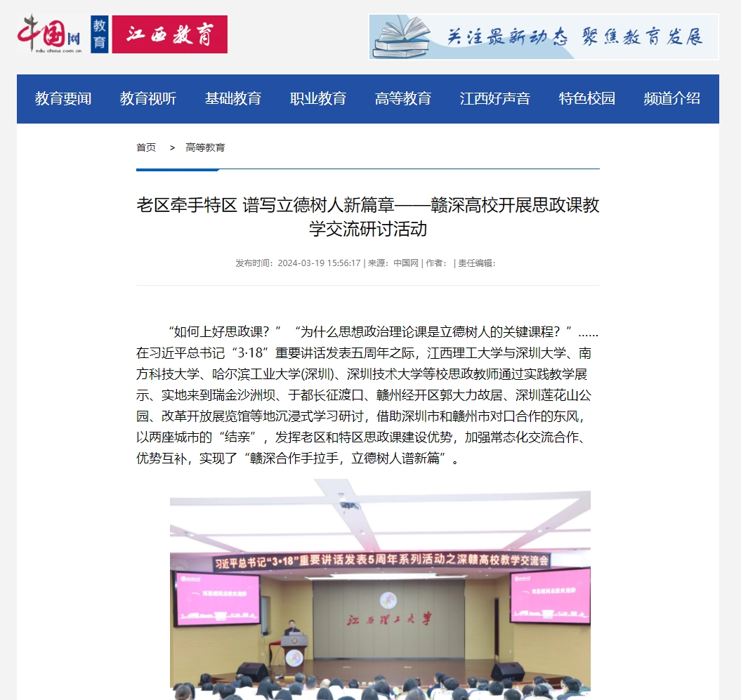 与深圳大学、南方科技大学、哈尔滨工业大学(深圳)、深圳技术大学等校思政教师通过实践教学展示、实地来到瑞金沙洲坝、于都长征渡口、赣州经开区郭大力故居、深圳莲花山公园、改革开放展览馆等地沉浸式学习研讨,借助深圳市和赣州市对口合作的东风,以两座城市的“结亲”,发挥老区和特区思政课建设优势,加强常态化交流合作、优势互补,实现了“赣深合作手拉手,立德树人谱新篇”。