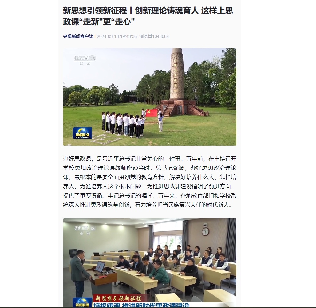 “思政课不仅应该在课堂上讲,也应该在社会中来讲。”每到秋季学期开学,由中宣部、教育部和中央广播电视总台联合主办的《开学第一课》专题节目总会如约而至。全国亿万名中小学生守候在屏幕前,共上一堂“大思政课”。从“行走的思政课”“场馆里的思政课”,到通过数字赋能,打造“云端上的思政课”,如今,课堂内外,内容新颖、形式活泼的思政教学越来越多,引导学生更直接地感悟伟大思想的实践伟力。