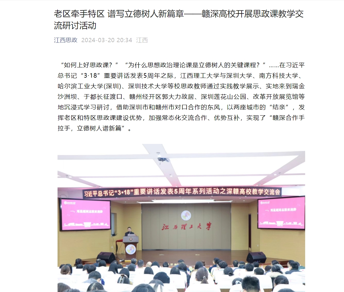 与深圳大学、南方科技大学、哈尔滨工业大学(深圳)、深圳技术大学等校思政教师通过实践教学展示、实地来到瑞金沙洲坝、于都长征渡口、赣州经开区郭大力故居、深圳莲花山公园、改革开放展览馆等地沉浸式学习研讨,借助深圳市和赣州市对口合作的东风,以两座城市的“结亲”,发挥老区和特区思政课建设优势,加强常态化交流合作、优势互补,实现了“赣深合作手拉手,立德树人谱新篇”。