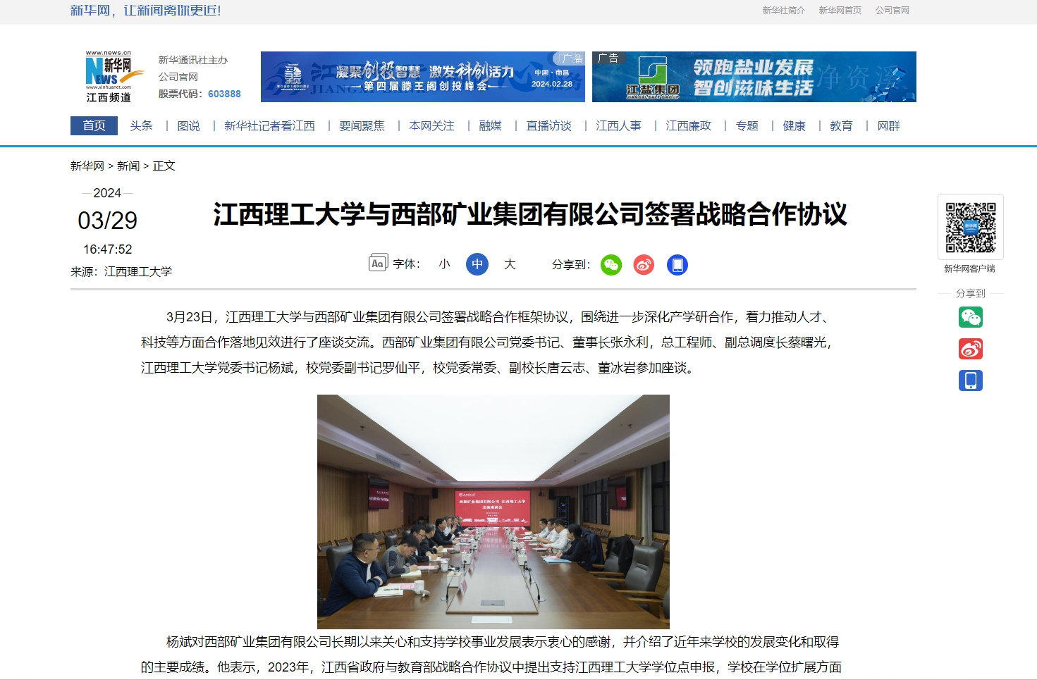 与西部矿业集团有限公司签署战略合作框架协议,围绕进一步深化产学研合作,着力推动人才、科技等方面合作落地见效进行了座谈交流。西部矿业集团有限公司党委书记、董事长张永利,总工程师、副总调度长蔡曙光,百家乐