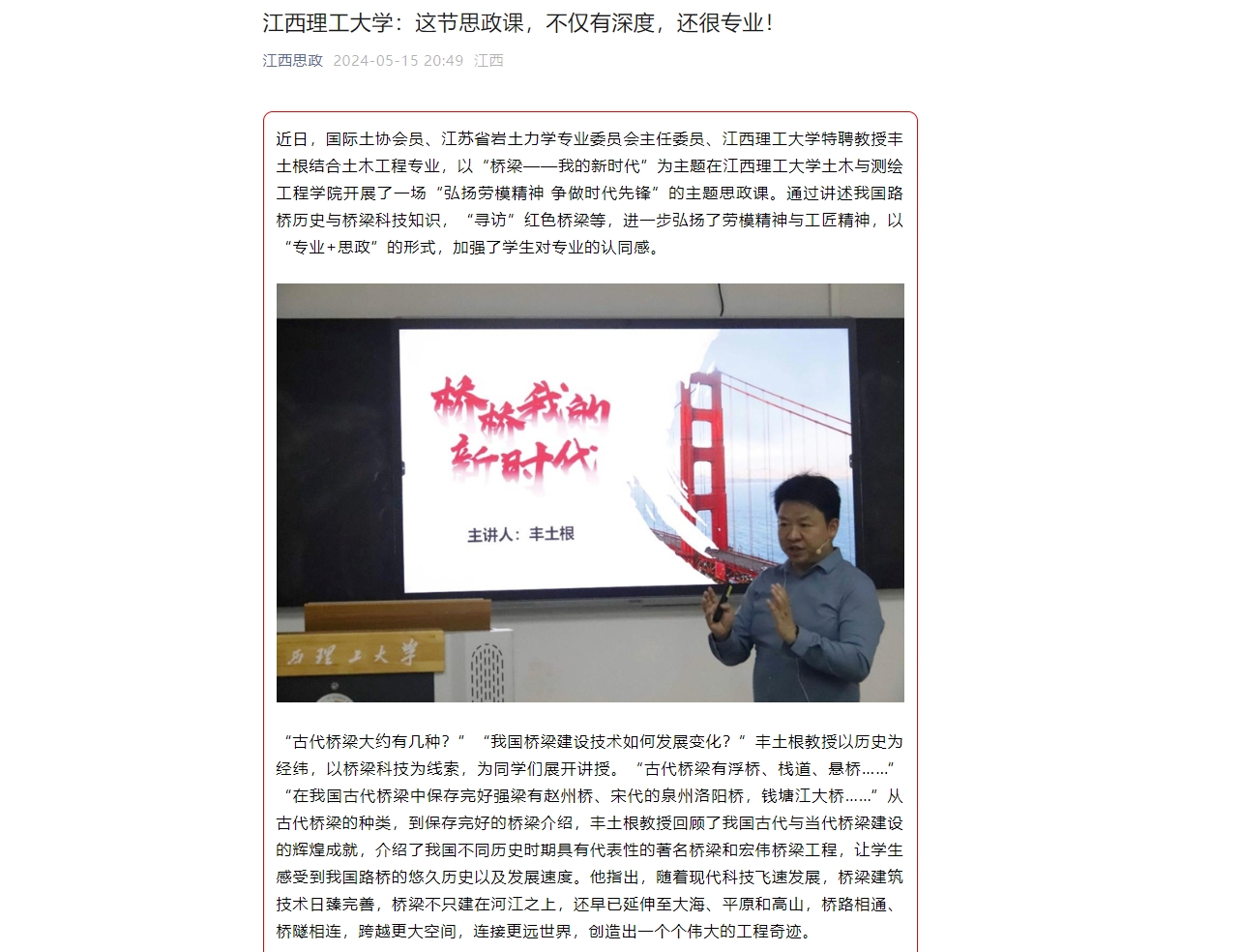 主题思政课上,丰土根教授还为同学们介绍了见证中共一大胜利召开的宣公桥,承继了红军艰苦卓绝的长征精神的云贵红军桥,沂蒙妇女不畏冰冷、舍生忘我用身体搭建的“人桥”,江西兴国的红军桥,瑞金武阳大桥,于都红军大桥,信丰嘉定桥……这些桥梁不仅是交通要道,更是红色文化的象征,承载着革命先烈的英勇事迹和崇高精神。在场的学生们都热血沸腾,土木222班封磊表示:“通过丰教授的介绍,我学习到了先辈们的造桥精神和吃苦精神,作为江西人,未来将持续深入江西各地挖掘红色桥梁故事,让一座座精神图腾在赣鄱大地上赓续相传。”