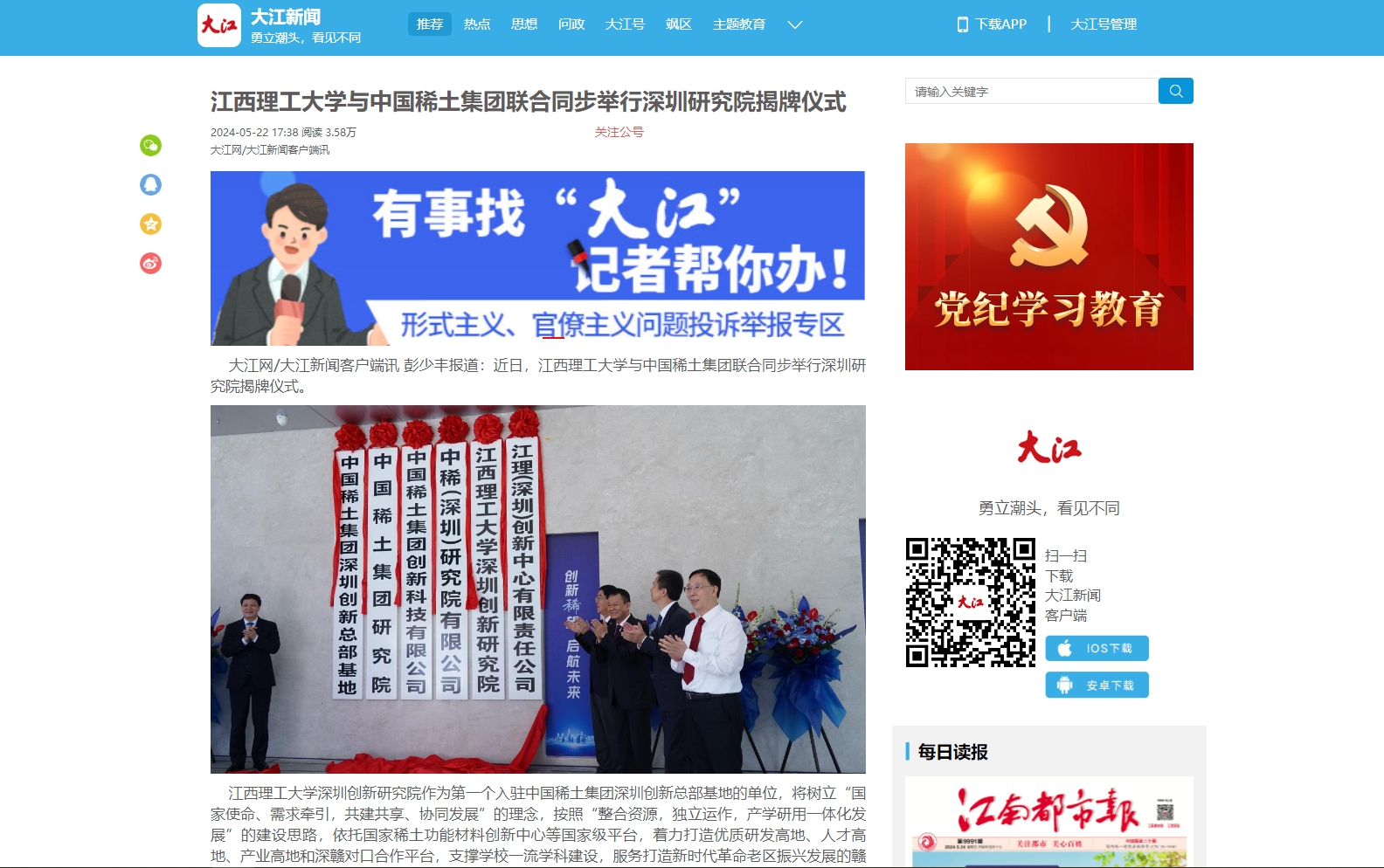 与中国稀土集团联合同步举行深圳研究院揭牌仪式。
