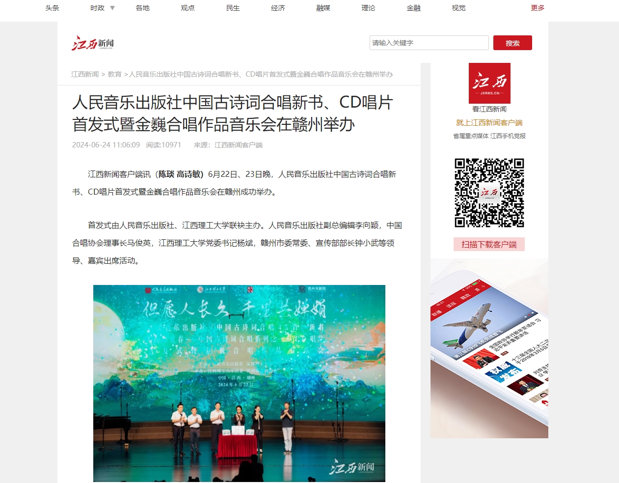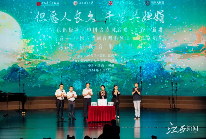 江西新闻客户端讯(陈琰 高诗敏)6月22日、23日晚,人民音乐出版社中国古诗词合唱新书、CD唱片首发式暨金巍合唱作品音乐会在赣州成功举办。