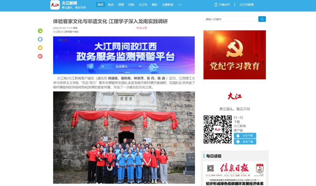 马克思主义学院“志远·笃行”青年志愿服务实践队走进龙南市杨村镇开展调研,实践队队员体验了杨村镇独特的民俗特色和浓厚的客家风情,开启了一次难忘的文化之旅。