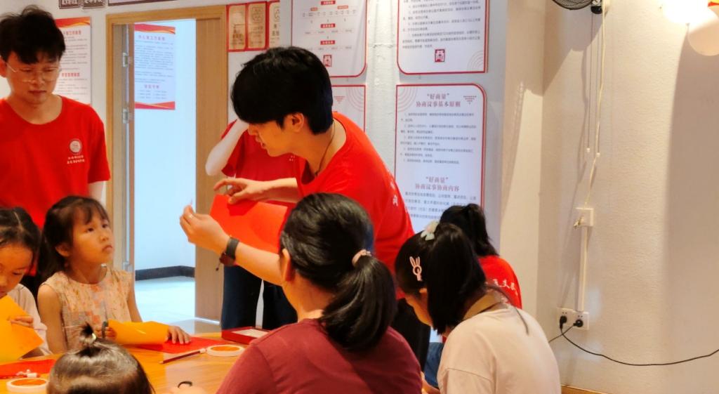 “我们先画一颗大五角星,再画上四颗小五角星,宝贝们在剪纸的过程中要小心一点哦,剪好后粘在红色的画纸上,一面国旗就完成了。”在手工剪纸活动中,队员徐纯杰为孩子们做着示范, 在队员们的耐心指导下,孩子们纷纷动手绘制五角星,制作出一张又一张鲜艳明亮的国旗。
