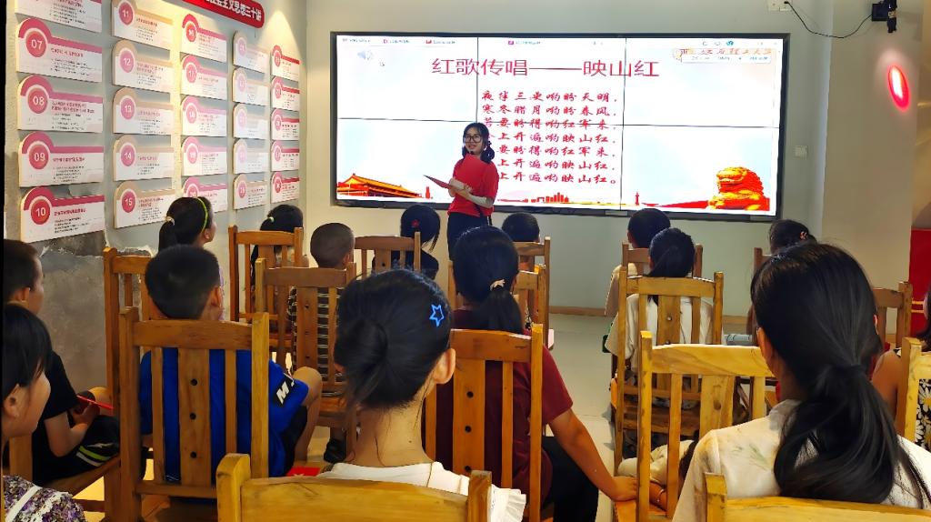 “夜半三更哟盼天明,寒冬腊月哟盼春风……”随着队员朱思敏深情的歌声响起,孩子们的眼眸中闪烁着好奇与憧憬,仿佛穿越时空,置身于那段激情燃烧、理想飞扬的峥嵘岁月。紧接着,孩子们自发地加入合唱,歌声汇聚成一股真挚、热烈的力量,对革命英雄的敬仰、对美好理想的追求、对祖国母亲的热爱,如种子般在孩子们稚嫩的心田悄然萌发。