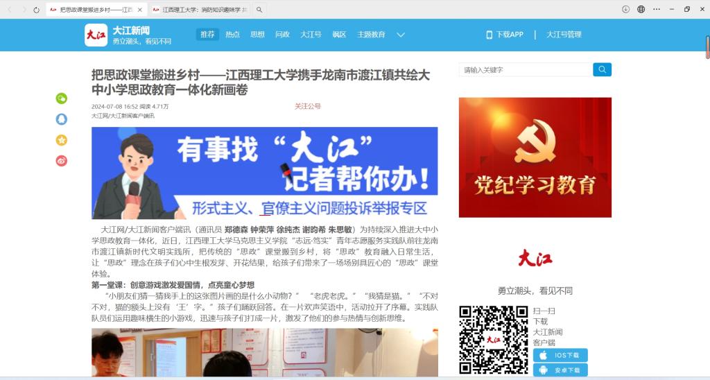 马克思主义学院“志远·笃实”青年志愿服务实践队前往龙南市渡江镇新时代文明实践所,把传统的“思政”课堂搬到乡村,将“思政”教育融入日常生活,让“思政”理念在孩子们心中生根发芽、开花结果,给孩子们带来了一场场别具匠心的“思政”课堂体验。