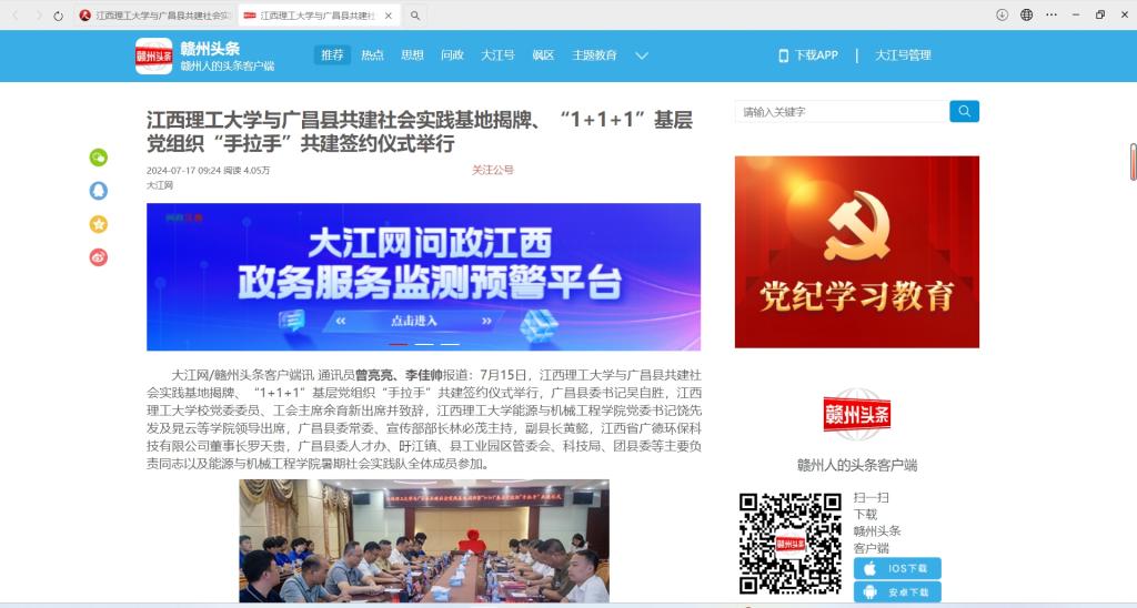 能源与机械工程学院第三党支部、广昌县旴江镇机关党支部、江西省广德环保科技股份有限公司党支部授牌,三方共建支部代表作了发言并进行了签约。