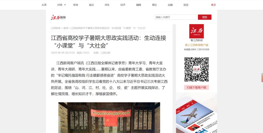 江西新闻客户端讯(江西日报全媒体记者李芳)青年大学习、青年大宣讲、青年大调研、青年大实践……暑期以来,由省委教育工委、省教育厅主办的“牢记嘱托强国有我 行走赣鄱感恩奋进”高校学子暑期大思政实践活动火热开展。全省各高校组织学生沿着党的十八大以来习近平总书记三次考察江西的足迹,围绕“山、河、江、村、社、企、 校、瓷”主题开展实践探访,了解社情民情,增长知识才干,厚植家国情怀。