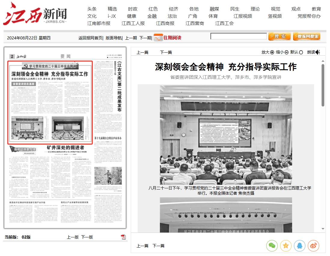 8月21日下午,学习贯彻党的二十届三中全会精神省委宣讲团宣讲报告会在萍乡学院举行。省委宣讲团成员、省社科院党组书记陈运平作宣讲报告。