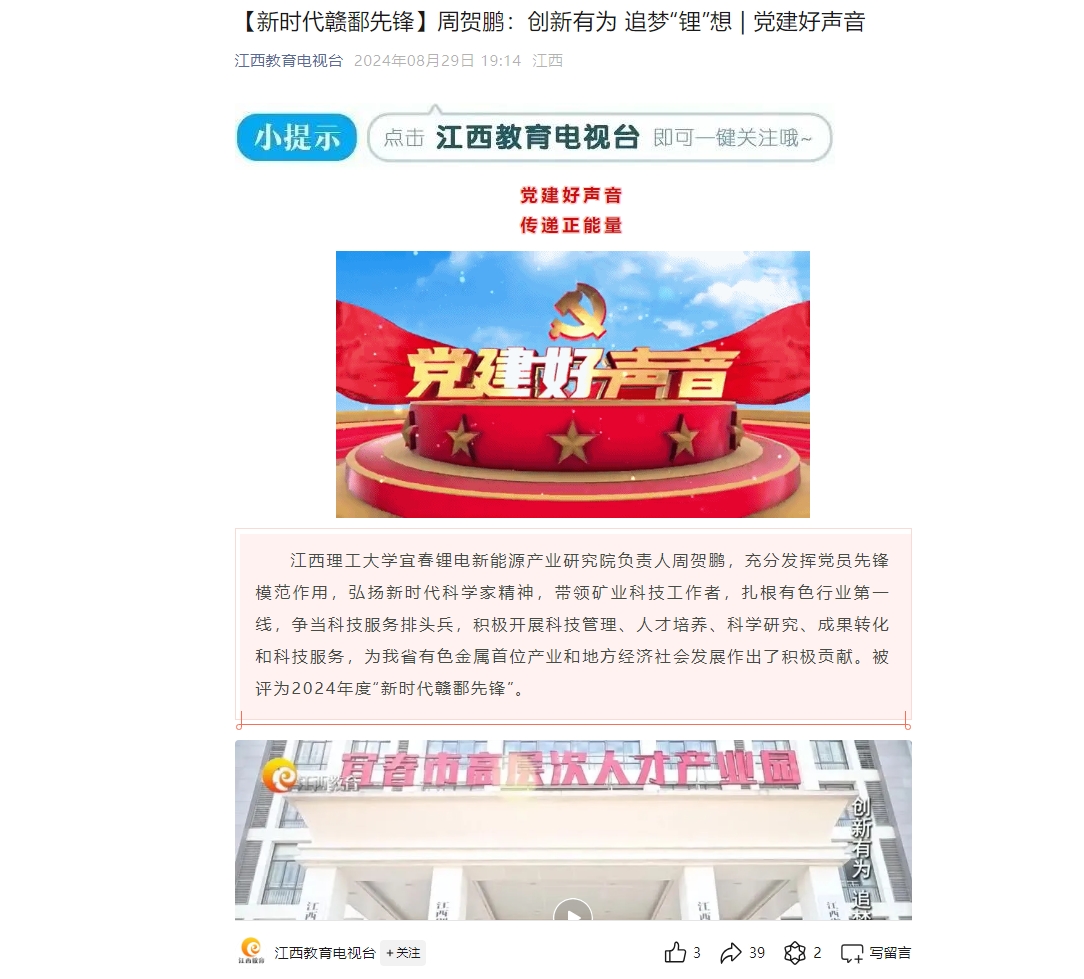百家乐 宜春锂电新能源产业研究院负责人周贺鹏,充分发挥党员先锋模范作用,弘扬新时代科学家精神,带领矿业科技工作者,扎根有色行业第一线,争当科技服务排头兵,积极开展科技管理、人才培养、科学研究、成果转化和科技服务,为我省有色金属首位产业和地方经济社会发展作出了积极贡献。被评为2024年度“新时代赣鄱先锋”。
