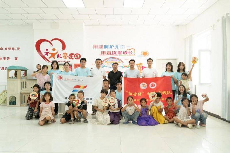 实践队员们通过一对一的指导方式,协助孩子们进行美术绘画活动,将中华的优秀传统文化和红色文化转化为红色教育资源,展现了美育教育的思想深度、人文关怀和实践价值。在绘画创作的过程中,孩子们手中的画笔似乎被赋予了神奇的力量,他们将庄严的国旗、璀璨的党徽、喜庆的灯笼以及各民族的传统服饰巧妙融合,创作出一幅幅充满想象力的艺术作品。实践队员们巧妙地将红色文化和传统文化融入艺术创作之中,实现了以美育促进“心育”的教学目标,增强了乡村孩子们在艺术领域的归属感和自豪感。
