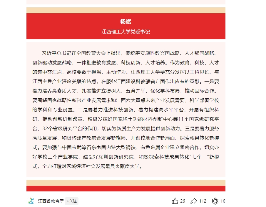 现场聆听了习近平总书记在全国教育大会上的重要讲话,深感振奋、备受鼓舞。总书记的重要讲话高屋建瓴、思想深邃、内涵丰富,体现了党中央对教育工作的高度重视,对教育工作者的亲切关怀,为建设教育强国指明了前进方向、提供了根本遵循。全省教育系统将认真学习贯彻习近平总书记重要讲话精神,牢牢把握教育的政治属性、人民属性、战略属性,锚定建成教育强国战略目标,推动大会精神入脑入心、工作部署落地见效。坚定不移落实好立德树人根本任务,深化“大思政课”综合改革试验区建设,优化义务教育资源配置,深化产教融合、校企合作,推进高等教育分类管理改革,强化教育对科技和人才的支撑作用,培养造就新时代高水平教师队伍,统筹深化教育综合改革和扩大教育对外开放,为加快推进教育强国建设贡献江西力量。