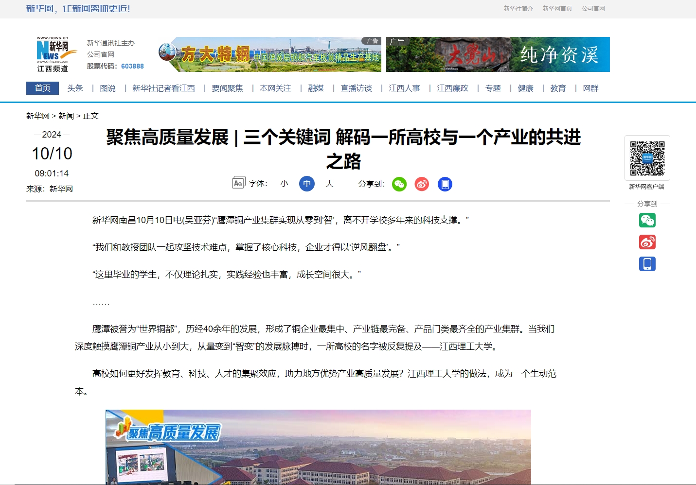 新华网南昌10月10日电(吴亚芬)“鹰潭铜产业集群实现从零到‘智’,离不开学校多年来的科技支撑。”