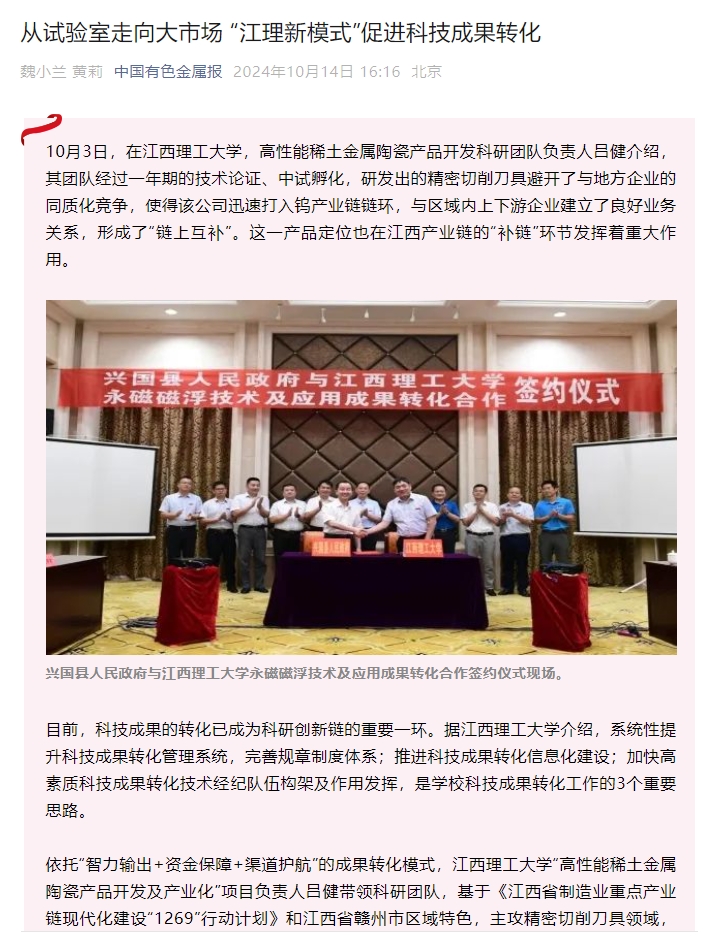 高度重视科研创新及成果转化。聚焦稀土、铜、钨、锂电、钢铁5大资源综合开发与利用特色领域,提出了“服务国家战略需求、服务区域和行业发展”的办学使命,“建设江西一流、全国较大影响、行业地位突出、区域最具贡献的有特色高水平大学”的办学目标,“以贡献求支持、以特色争优势、以创新谋发展”的办学思路,做好有组织科研攻关,探索出了一条跨越科技成果转化“死亡谷”、架起科技成果产业化“铁索桥”的“七个一”的“江理新模式”:通过组建一个管理机构、推出一套改革方案、打造一支专业队伍、建好一个孵化园区、建设一个转化平台、成立一个专项基金、搭建一个服务平台的“七个一”闭环系统,推动科技成果转化,真正让科研成果从“实验室”走向了“大市场”。