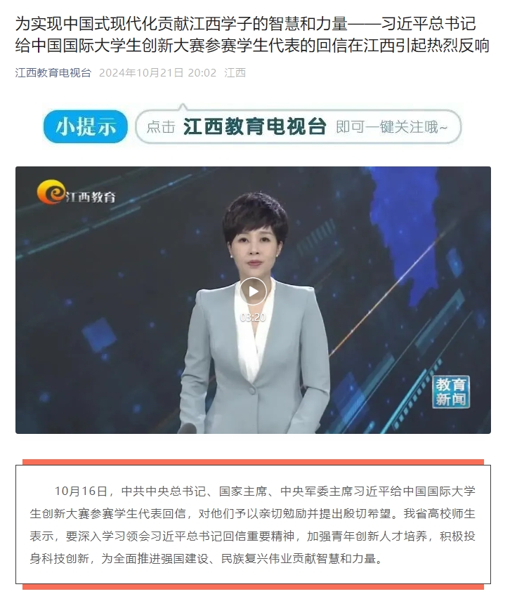 10月16日,中共中央总书记、国家主席、中央军委主席习近平给中国国际大学生创新大赛参赛学生代表回信,对他们予以亲切勉励并提出殷切希望。我省高校师生表示,要深入学习领会习近平总书记回信重要精神,加强青年创新人才培养,积极投身科技创新,为全面推进强国建设、民族复兴伟业贡献智慧和力量。