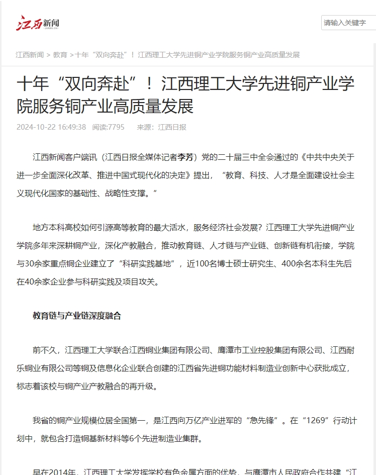 联合江西铜业集团有限公司、鹰潭市工业控股集团有限公司、江西耐乐铜业有限公司等铜及信息化企业联合创建的江西省先进铜功能材料制造业创新中心获批成立,标志着该校与铜产业产教融合的再升级。