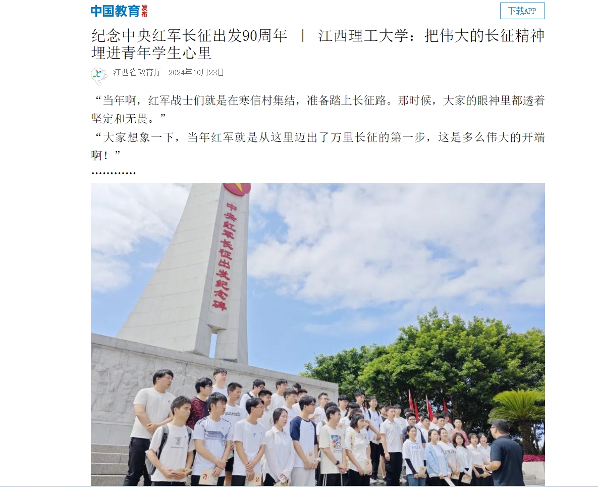 “90年前,同样在于都河畔,一支8.6万人的大军在四天四夜陆续渡河,踏上了震惊世界的远征。一条河,就此与一个民族息息相关。一群人,从此决定了一个国家的命运。”在于都中央红军长征集结出发历史博物馆,师生们瞻仰中央红军长征出发纪念碑、观看情景剧《告别》、聆听革命故事,大家在可视、可听、可感的沉浸式体验中重温革命历史,感受这片土地令人热血沸腾的红色力量。