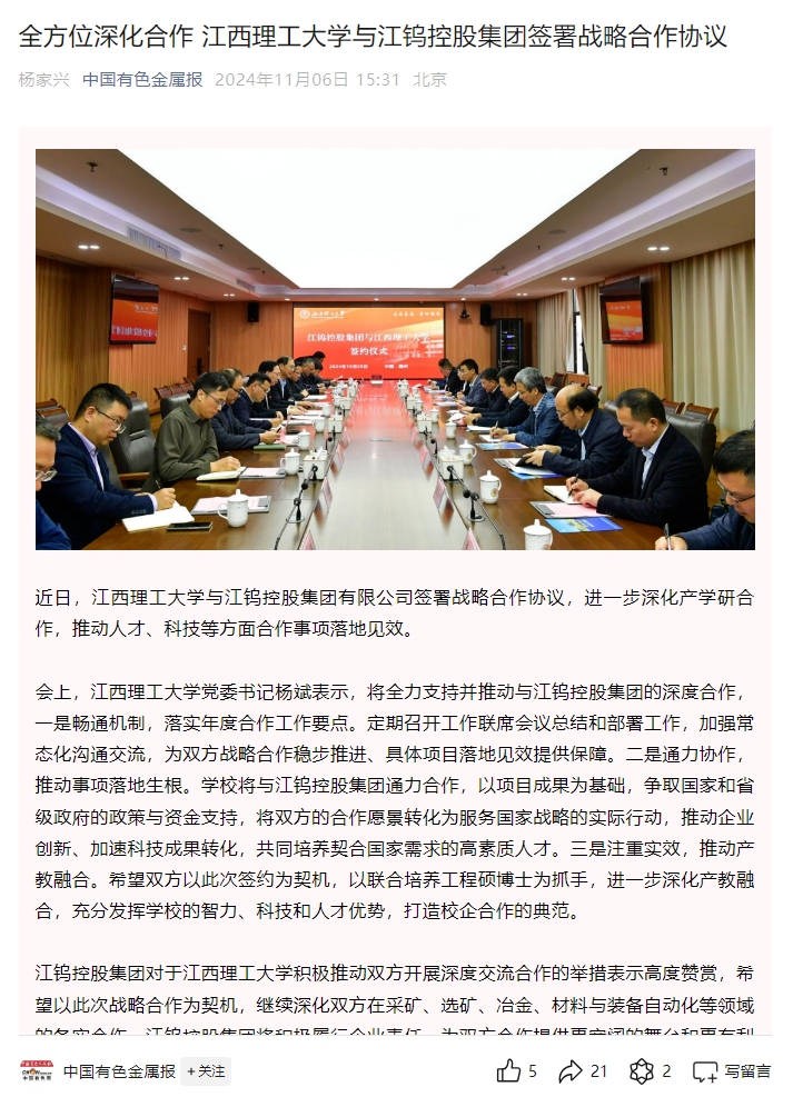 积极推动双方开展深度交流合作的举措表示高度赞赏,希望以此次战略合作为契机,继续深化双方在采矿、选矿、冶金、材料与装备自动化等领域的务实合作。江钨控股集团将积极履行企业责任,为双方合作提供更宽阔的舞台和更有利的条件,推动双方资源整合和优势互补,推进产学研用协同发展,创造校企合作共赢、共谋发展的良好局面。
