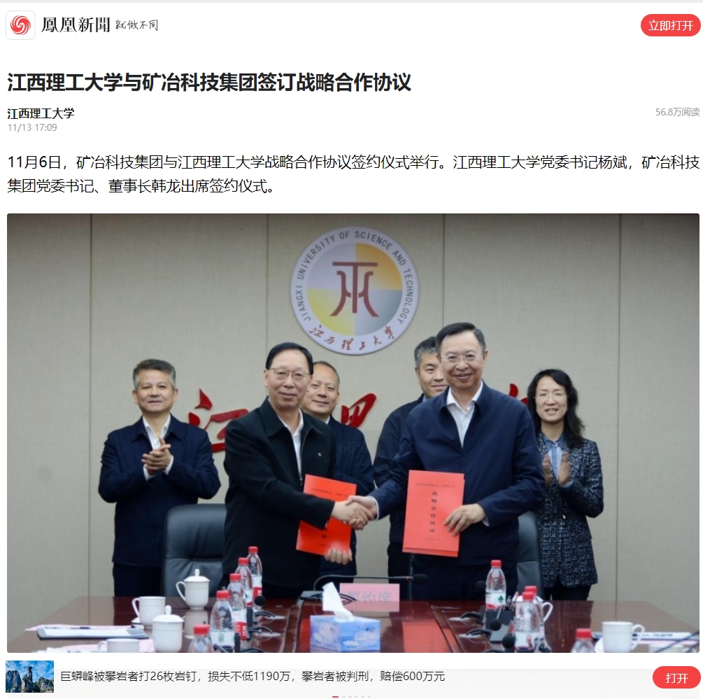 对矿冶科技集团的支持和帮助表示感谢。韩龙回顾了矿冶科技集团近70年的历史变迁,总结阐释了集团作为中央企业服务国家重大战略,引领行业技术进步,培育战略新兴产业的三大核心功能。他对双方合作提出了三点希望:一是要提高政治站位,服务国家战略;二是要履行好主体职责,发挥各自优势;三是要积极优化沟通保障机制。韩龙表示,矿冶科技集团的许多业务与学校的部分项目、与学生的发展高度契合,双方有很多合作的空间。此次正式签署战略合作协议,是一个非常重要的里程碑,双方在科研合作、人才培养等方面一定会迈上一个新的台阶。
