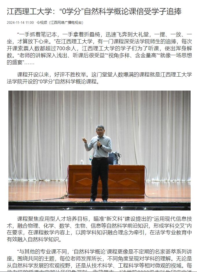 法学院开设的《自然科学概论》“0学分”必修课程,以培养法科生对自然科学发展的基本规律的进一步了解,增加自然科学知识,学习科学精神,锻炼理性思维,推动法学与自然科学学科交叉融合发展为目的,激发学生的学习兴趣和创新精神,助力学校高质量复合型法治人才培养。