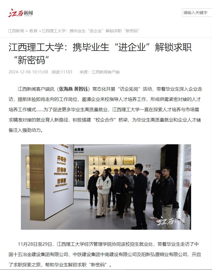 经济管理学院协同该校招生就业处,带着毕业生走访了中国十五冶金建设集团有限公司、中铁建设集团中南建设有限公司及阳新弘盛铜业有限公司,开启了求职探索之旅,帮助毕业生解锁求职“新密码”。