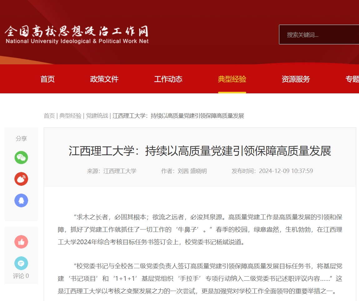 作为一所扎根赣南革命老区办学的行业特色高校,深入贯彻落实习近平总书记考察江西重要讲话精神和关于稀土产业发展的重要指示精神,牢记殷切嘱托,聚焦国家战略和地方经济发展需要,持续以高质量党建引领保障高质量发展。