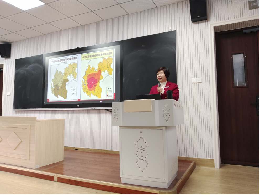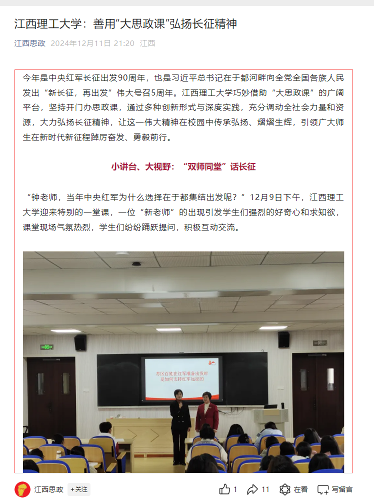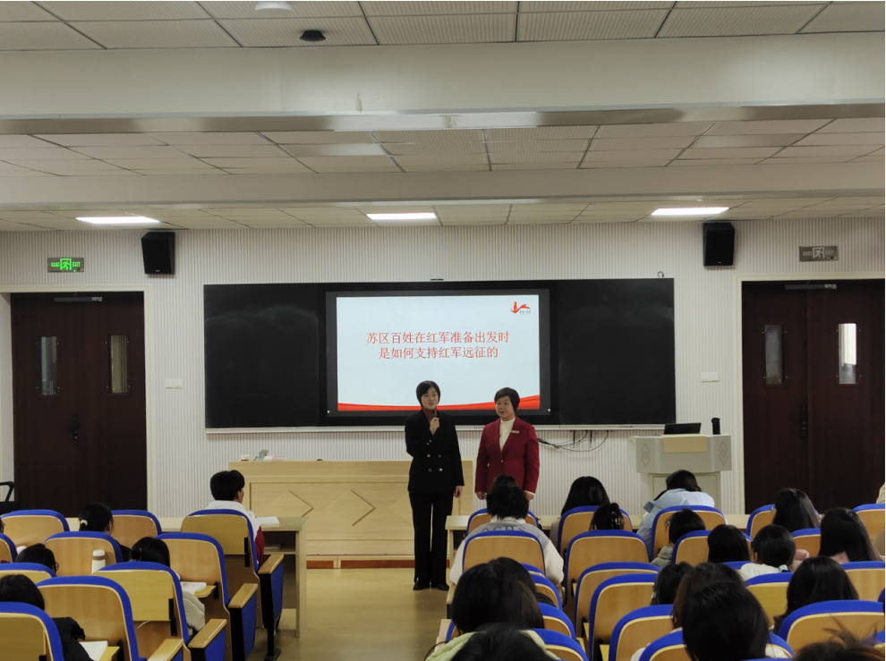 积极探索教学新模式,邀请了全国人大代表、于都中央红军长征集结出发历史博物馆纪念园管理办主任钟敏老师和马克思主义学院朱贤凌老师共同开展思政课“双师同堂”活动。钟敏老师曾为习近平总书记讲解介绍,得到总书记的高度评价。她凭借丰富的历史知识和生动的讲述技巧,把中央红军长征出发时那饱含悲壮色彩的场景与触动人心的故事栩栩如生地展现于学生眼前。她重点地讲述了苏区百姓如何毫无保留、竭尽所能地全力支援红军的动人情节,以及赣南子弟在长征漫漫征途中所作出的不可磨灭的卓越贡献。从百姓们省吃俭用为红军战士筹备粮食衣物,到青壮年义无反顾投身革命队伍踏上长征路;从军民齐心共克时艰的感人瞬间,到长征途中一个个彰显信念与情谊的经典事例,她皆细致入微地进行描绘。