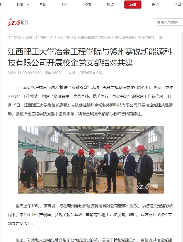 当天上午10时,廖春发一行在赣州寒锐新能源科技有限公司董事长刘政、总经理文定强的陪同下,来到企业生产现场,参观了解钴萃取、电解等先进工艺和设备。随后,双方召开了校企支部共建交流会。